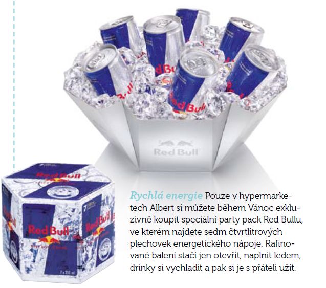 Není to však vše, co bude v Albertech k dispozici: Rychlá energie – Pouze v hypermarketech Albert si můžete během Vánoc exkluzivně koupit speciální party pack Red Bullu, ve kterém najdete sedm čtvrtlitrových plechovek energetického nápoje. Rafinované balení stačí jen otevřít, naplnit ledem, drinky si vychladit a pak si je s přáteli užít. No, nevím jak vy, ale tohle rozhodně vyzkoušime, pěkně na silvestra ![]()