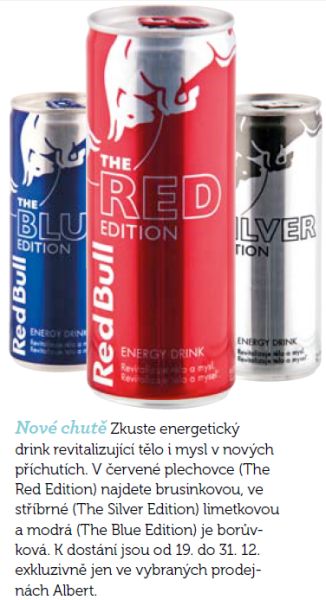 Barevné edice Red Bullů jsou na Slovensku třeba v Bille, no v ČR si zatím na svůj klasický debut musely počkat a zatím byly k sehnání pouze v některých klubech a podobných provozech. To se však již ve středu 19. prosince změní, jelikož se objeví exkluzivně jen ve vybraných prodejnách sítě Albert. Nevíme ani, jestli to budou supermarkety, hypermarkety nebo směs obojího. Pravděpodobně se to dozvíme až z letáků daných poboček.