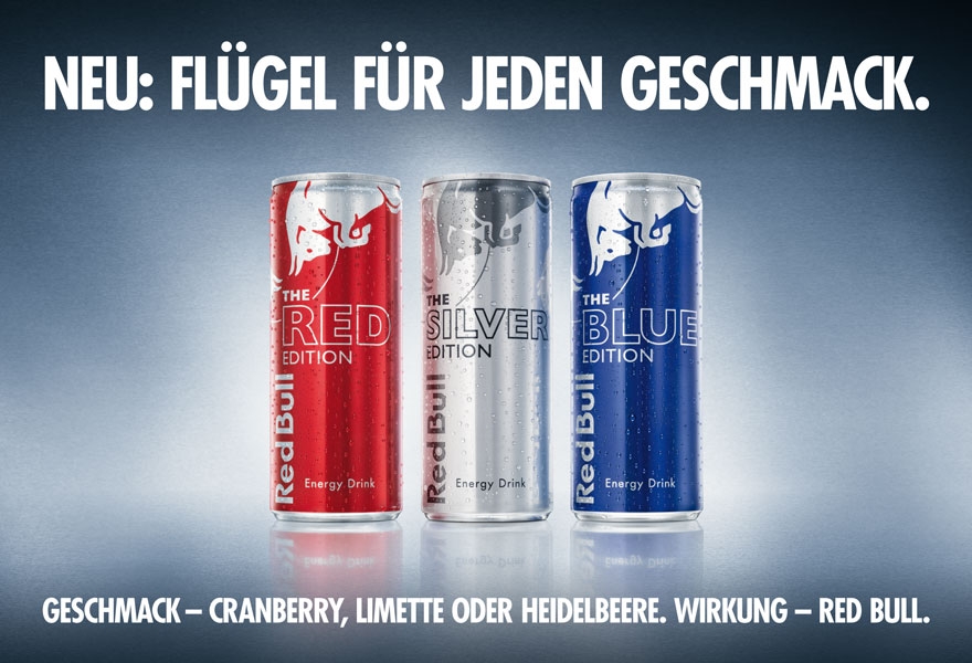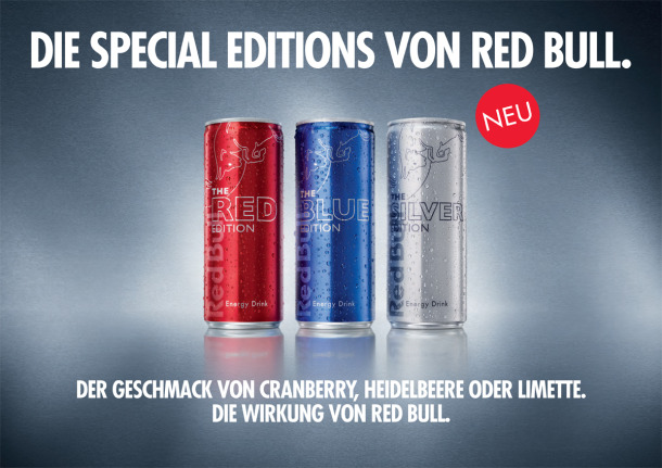 Zhruba před rokem se na rakouském trhu objevila testovací série Red Bullu Red Edition. Limitovaný nápoj s příchutí brusinek byl dodáván především do hospod, kaváren a restaurací s tím, že se v případě úspěchu začne vyrábět ve velkém, ale pouze po dobu zhruba 1 roku. Úspěch na sebe nenechal dlouho čekat, Rakušáci prostě Red Bull milují a díky tomu později vznikly také další dvě edice s předpokladem roční výroby – limetkový Silver a borůvkový Blue. Příchutě sedí barvám a celá trojice se skládá z barev použitých na klasické plechovce.