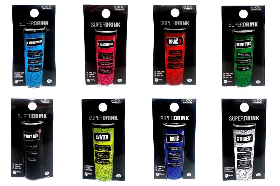 Albi možná znáte. To když chcete někomu udělat radost ke svátku, narozeninám, výročí… a koupíte přáníčko, tak je většinou právě od Albi. Pod touto značkou dárkových předmětů nebo malých a vtipných dárků se samozřejmě skrývá mnohem víc, než jen přáníčka – propisky, hrníčky, trika, sklenice, blbosti takové i makové. A nově také 8 různých energetických nápojů s názvem Albi SuperDrink a neuvěřitelnou cenou. Kus za 69,– !!!