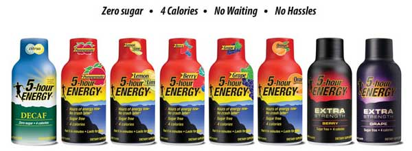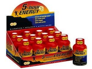 5-Hour Energy shot není označen za energy drink ani nápoj, ale nese popisek „kompaktní energy shot určený pro zaneprázdněné dospělé“. Na produktu tak nemusí být ani uveden přesný obsah kofeinu, v testech bylo zjištěno celých 215mg, tedy 2× tolik než v běžném šálku kávy a skoro tolik, jako se nachází ve „smrtícím“ 710ml Monsteru Mega (240mg). Podle doktorů může docházet ke křečím po vypití 2 a více těchto shotů po sobě.