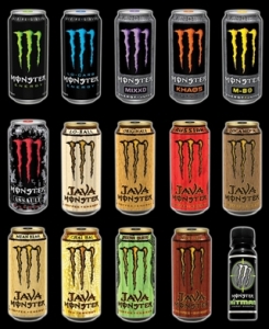 4 z 6 Monsterů zná i ČR. Classic, Lo-Carb, Ripper a nově i Khaos patří mezi klasické energiťáky. Další dva pro Evropu (přesněji aktuálně pro Švédsko, Finsko a Itálii) vyráběné drinky jsou Monster X-presso Hammer a Monster X-presso Midnite. Oba mají 284ml plech a jak již název napovídá, je to energy+coffee (káva).